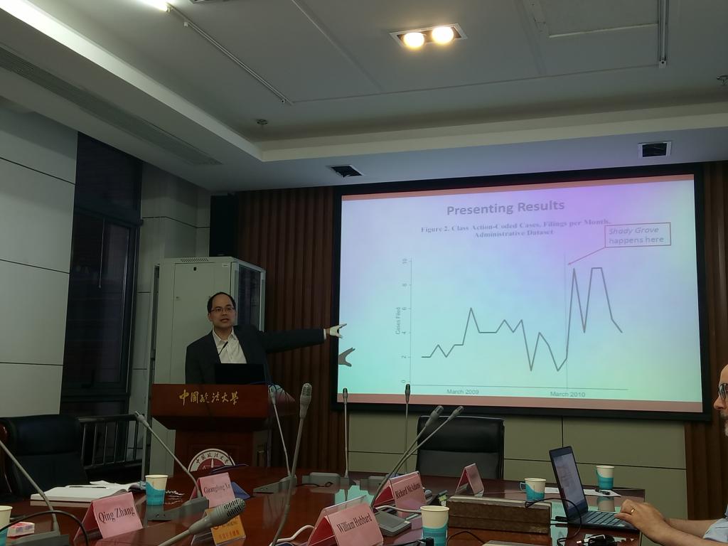讲座中,McAdams教授和Hubbard教授分别就不同的主题进行了报告。Hubbard教授报告的主题是“New Direction in the Empirical Study of Courts(司法系统实证研究的新方向)”。Hubbard教授首先以“在司法系统中数据能告诉我们些什么”的问题,引出了实证研究方法对司法系统问题研究的重要性。他认为,实证研究能够回答一系列对于法律工作者和学者而言十分重要,却难以由法律本身来回答的问题。随后,Hubbard教授对司法系统的实证研究问题从四部分进行了介绍。在第一部分,Hubbard教授阐述了实证研究的目标。他认为,实证研究的目标主要包括描述性目标与实证性目标,同时实证数据也有一定的局限性。在第二部分,Hubbard教授介绍了司法系统实证研究的主要论题,包括法官行为,法律修改对案件结果以及社会的影响,律师对案件的作用,以及诉讼当事人行为的影响因素等。在第三部分Hubbard教授介绍了数据的来源和收集工作。他指出,在理想的情况下,我们可以通过现有的数据库进行实证研究,但在现实中,往往并没有这类现成数据可供参考。在这种情况下,就需要我们自己或利用计算机来对原始数据进行处理,或是通过调查或实验的方法来创造新的数据。在第四部分,Hubbard教授对数据分析的方法进行了介绍。他指出,在描述性工作方面,我们首先需要对数据进行总结,使其以可视的方式表现出来。在实证性工作方面,为表明因素X对结果的影响,我们需要分别设置包含因素X的实验组与不包含因素X的对照组,并对两组的结果进行比较。Hubbard教授还结合近期的学术文献,对司法系统的实证研究问题作了进一步的阐释。