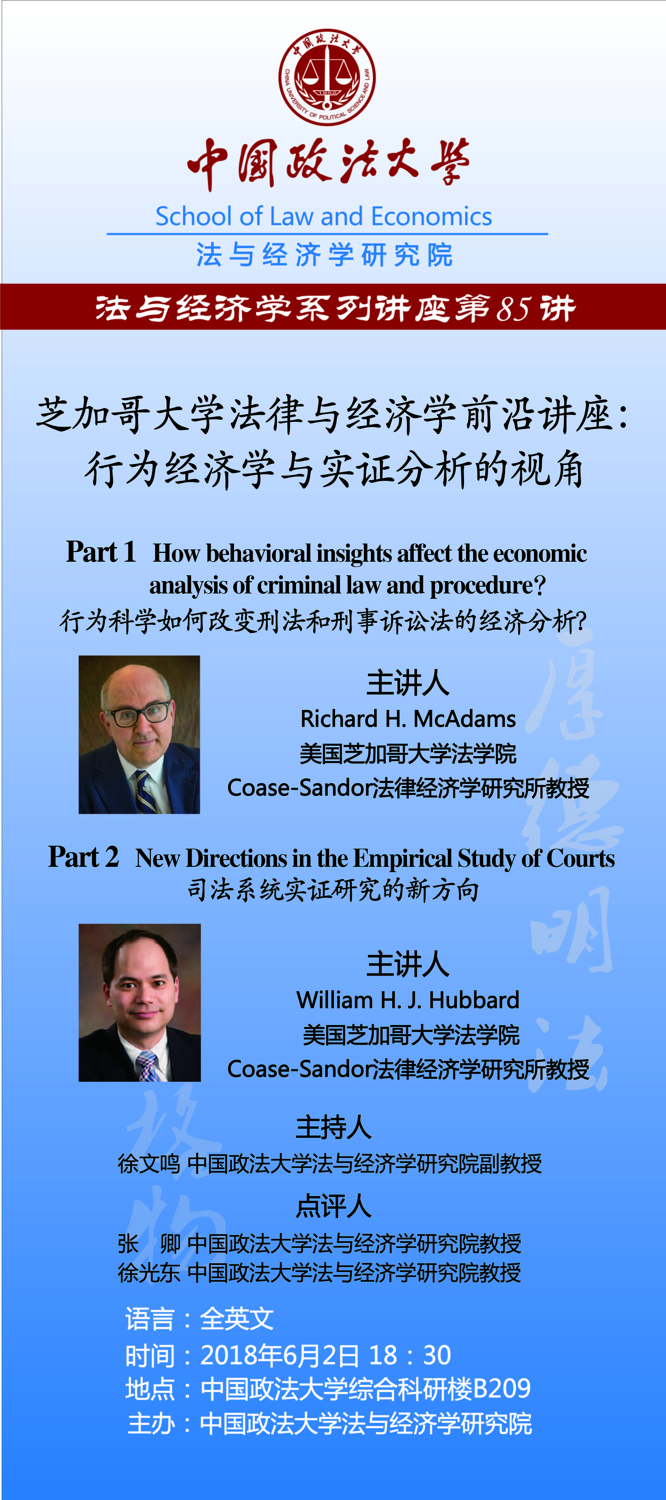 2018年6月2日,芝加哥大学法学院Coase-Sandor Institute for Law and Economics的Richard H. McAdams教授和William H.J. Hubbard教授访问365体育投注365.tv,并作了题为“法律与经济学前沿问题:行为经济学与实证分析的视角”的学术讲座。讲座由365体育投注365.tv徐文鸣副教授主持,徐光东教授和张卿教授先后作了点评。
