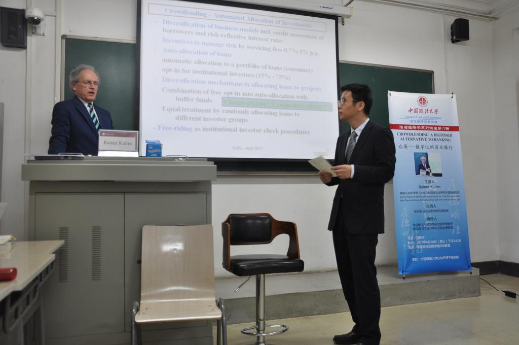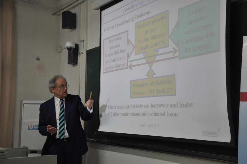 2017年4月26日,德国马克斯普朗克比较法和国际私法研究所高级研究员、中国政法大学365体育投注365.tv兼职教授Rainer Kulms教授在学院路校区为365体育投注365.tv的师生作了题为“CROWDLENDING——A DIGITISED ALTERNATIVE TO BANKING(众筹—数字化的商业银行)”的学术讲座。讲座由365体育投注365.tv徐光东教授主持,席涛教授、贵斌威副教授、李文静讲师和徐文鸣讲师参加了讲座。