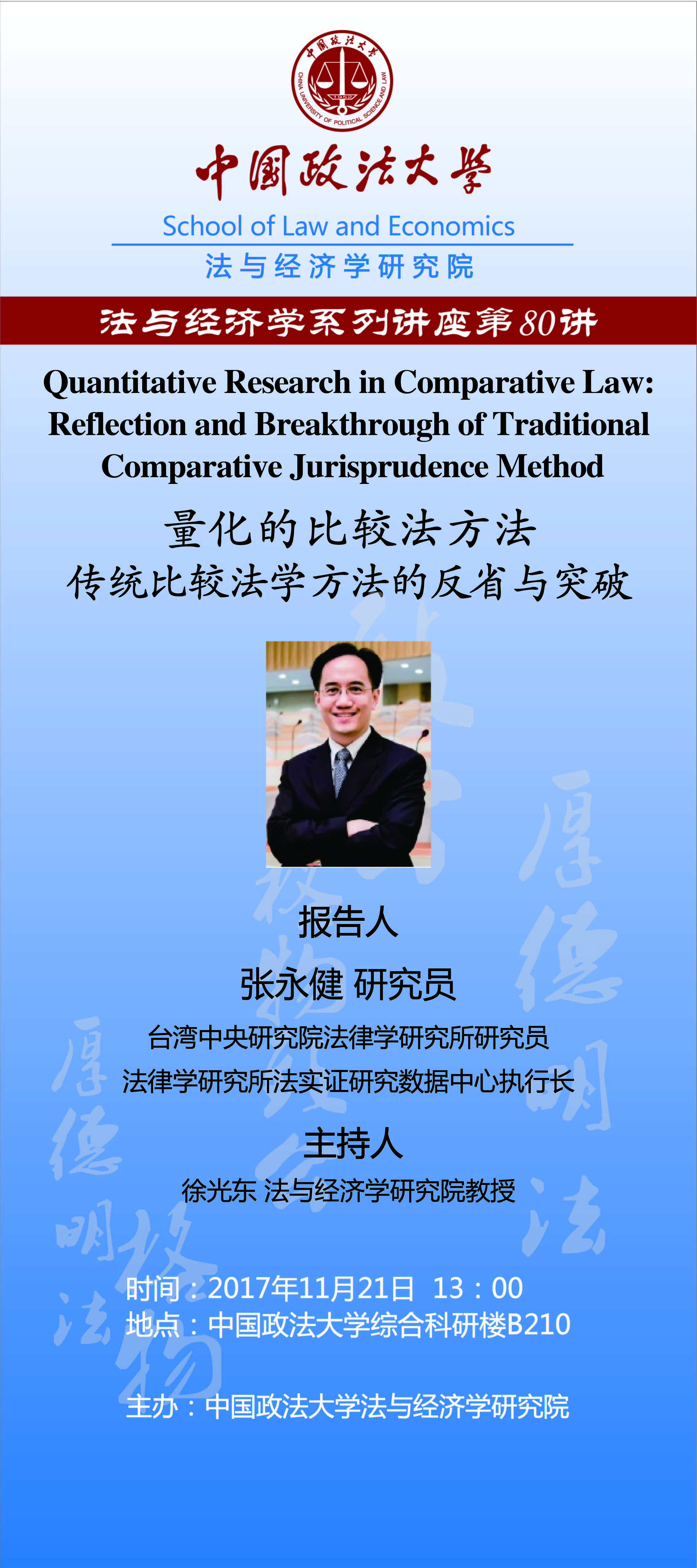 2017年11月21日,台湾中央研究院法律学研究所实证研究数据中心执行长张永健研究员在学院路校区为365体育投注365.tv的师生作了题为“量化的比较法方法——传统比较法学方法的反省与突破”的学术讲座。讲座由365体育投注365.tv徐光东教授主持,贵斌威副教授和徐文鸣助理教授点评。
